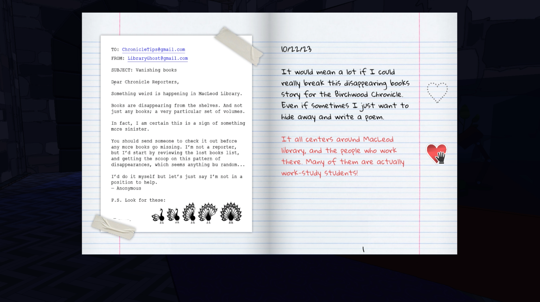 - Use the red heart sticker to focus Ruby's thoughts on particular journal entries, and hone in on important objects and leads.